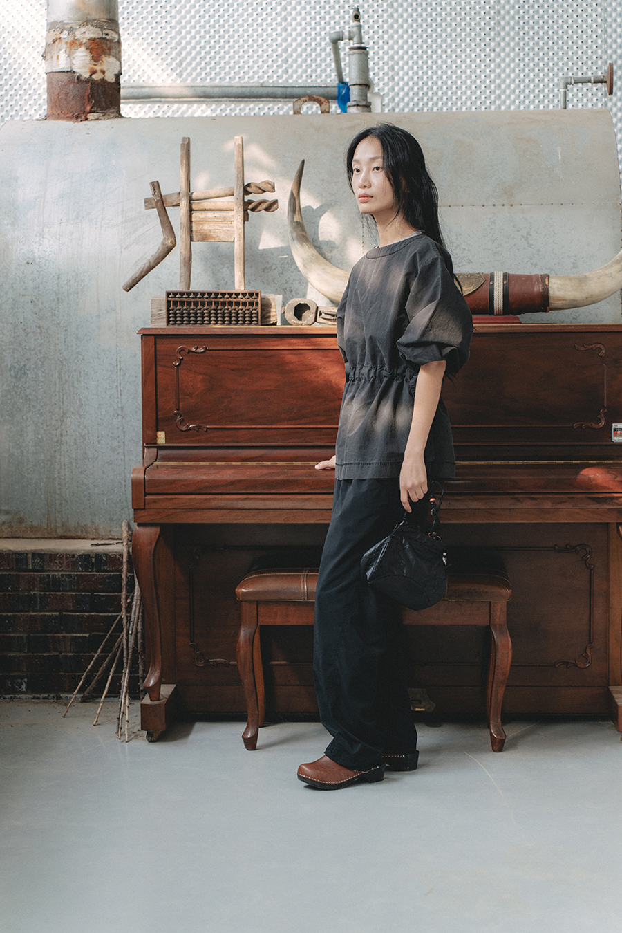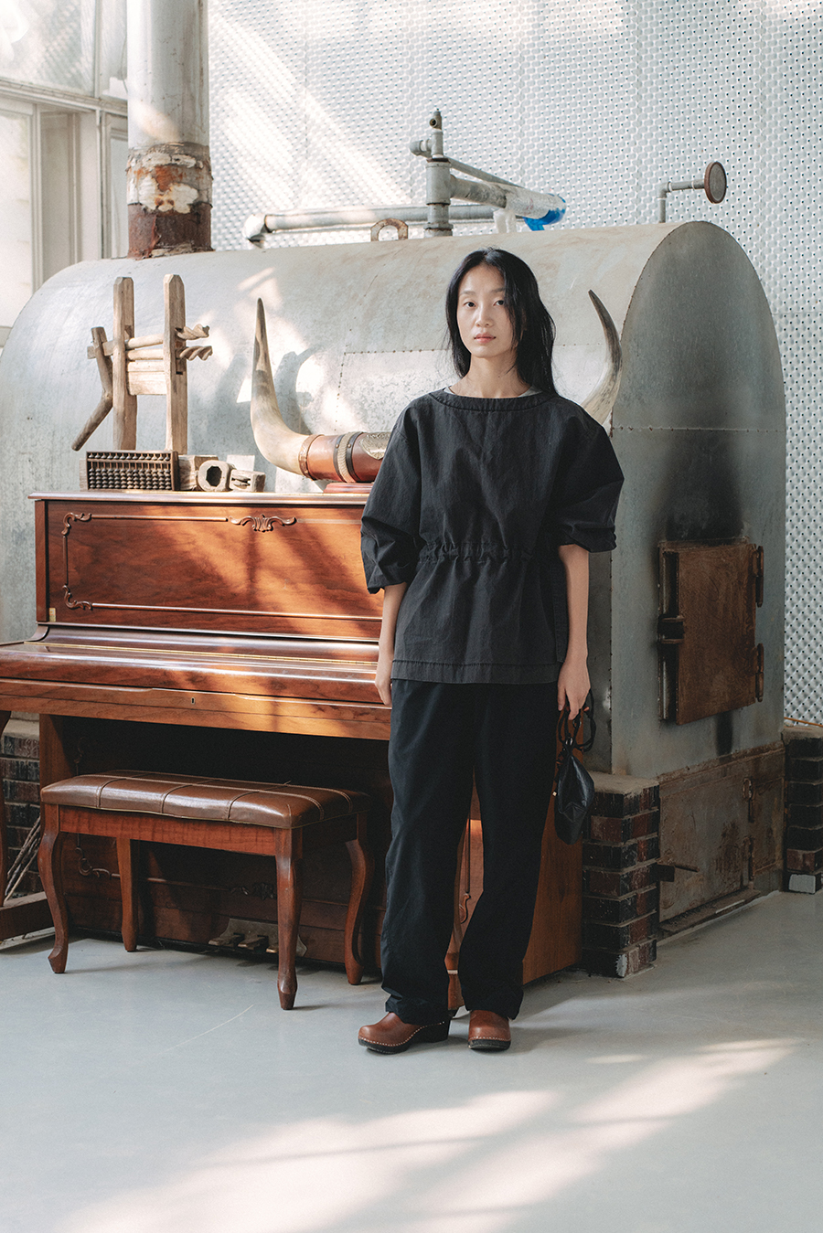 블랙 컬러의 경우 일부 제품 사진에 새제품이 아닌 수목의 디자이너가 가지고 있던 장시간 착용을 한 제품을 사용했습니다. (제품 디테일 사진과 커피 드립하는 씬의 사진이 새제품의 모습입니다.) 사진처럼 빈티지한 느낌을 빠르게 만들고 싶으신 분들은 제품을 의류 건조기에 자주 돌리시면 되는데, 이 때 넥과 밑단의 자수 스티치 손상에 주의해주세요. (금속 부자재가 사용된 의류와 함께 건조기 사용에 유의해 주세요.)