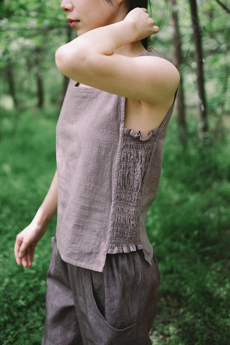 무명 슬리브리스 탑의 천연 염색은 작년부터 꾸준히 테스트했고, 약 10가지가 넘는 재료로 여러 가지 색을 입혀봤으나, 그 중에서도 제품 디자인과 가장 잘 어울리고 견뢰성이 좋은 컬러 두 가지를 선별하였습니다.