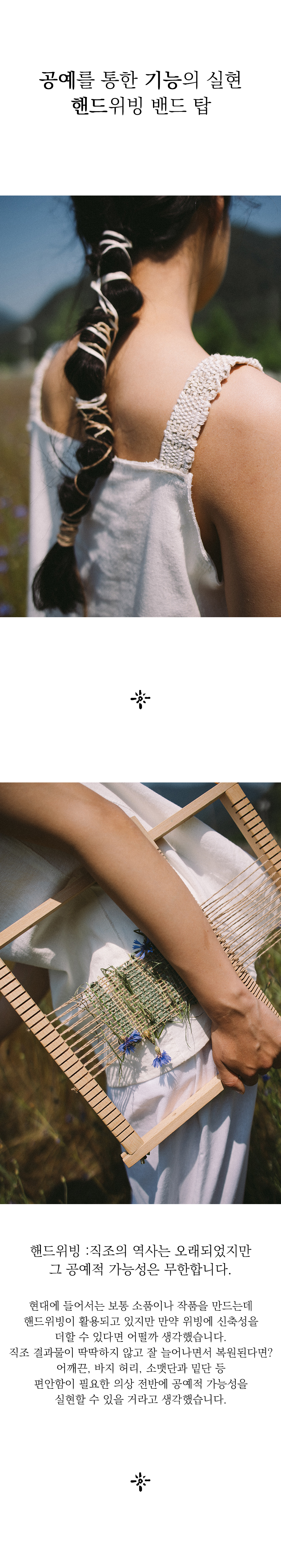 오랫동안 열심히 준비한 핸드위빙 탑을 소개해드릴 수 있게 되어 기쁩니다! 틈틈이 위빙 밴드를 열심히 짰지만, 작업할 수 있는 수량에 한계가 있어서 수량을 많이 준비해드리지 못해 죄송합니다. 그래도 핸드메이드 작업의 특성을 살려서 최대한 다양한 컬러로 작업해보려고 했습니다 :) 앞으로 핸드위빙 작업의 작업성을 올리기 위해 계속 연구하고 노력하겠습니다.