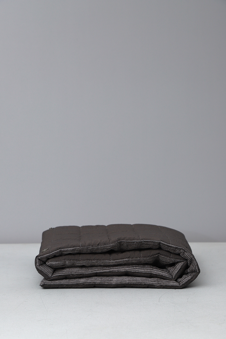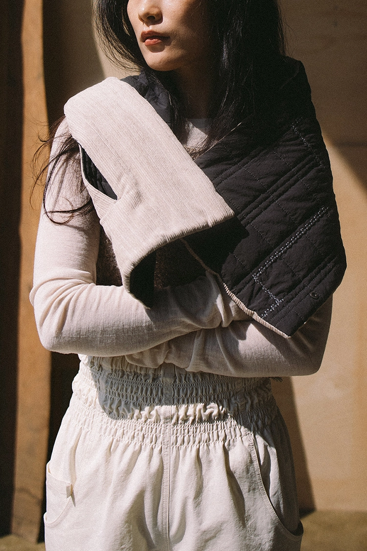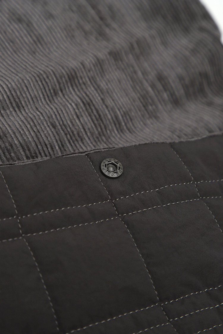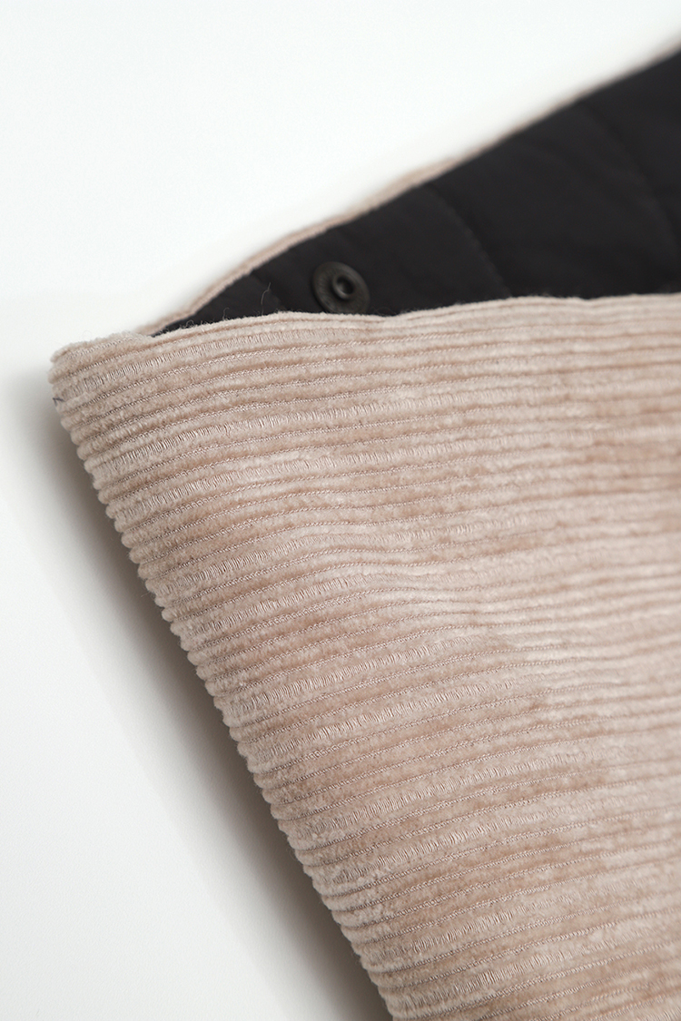 퀼팅 반대쪽 소재는 울과 면, 비스코스가 혼방된 불규칙한 도비 직물의 코듀로이 소재입니다. 손맛이 나면서도, 아주 부드럽고 따뜻한 촉감이 특징인 소재입니다.