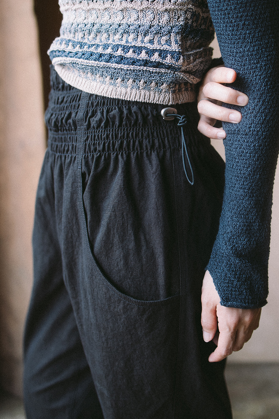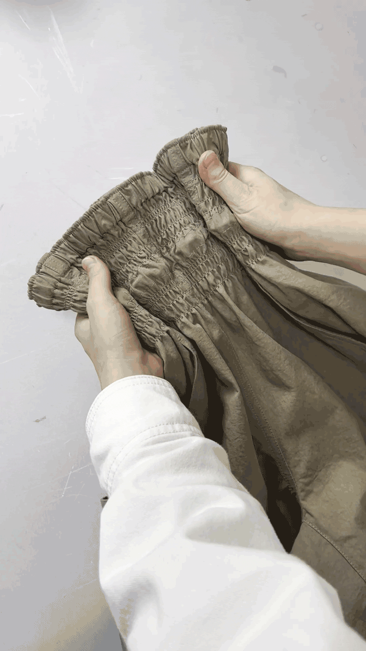 허리의 스모킹 밴드는 스토퍼로 사이즈를 줄일 수 있습니다.