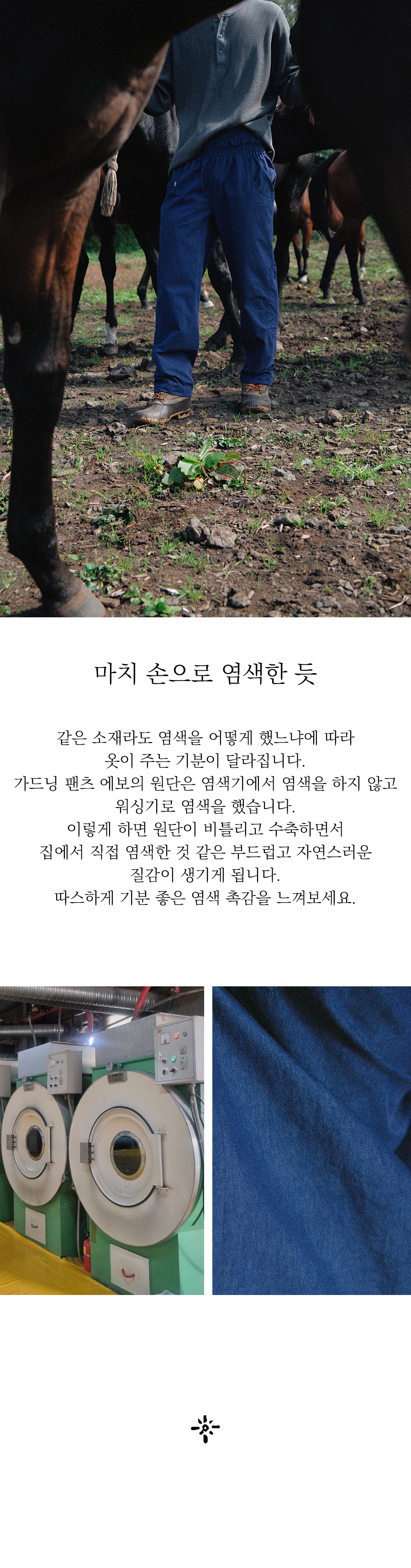 원단을 자연스럽게 수축시키면서 염색하여 마치 손으로 염색한듯한 질감이 특징입니다.