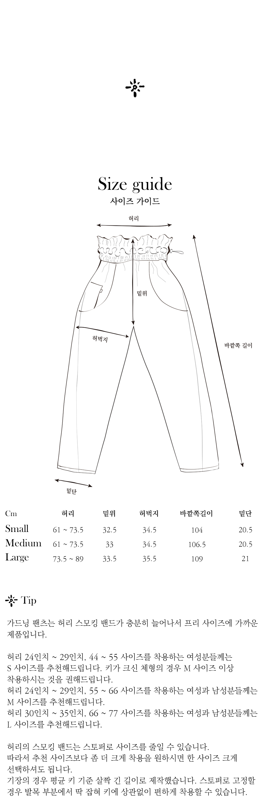허리의 스모킹 밴드는 스토퍼로 사이즈를 줄일 수 있습니다.