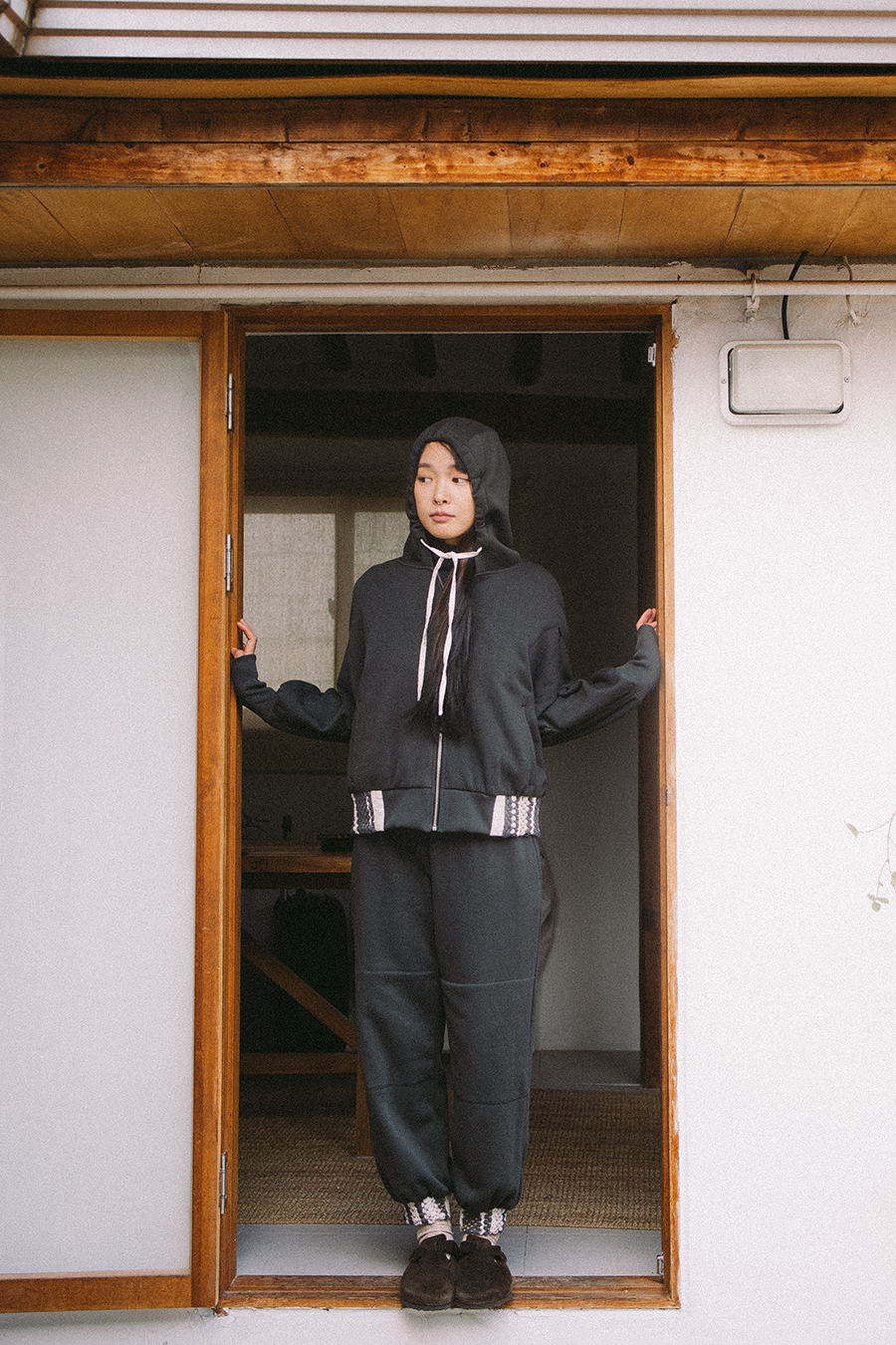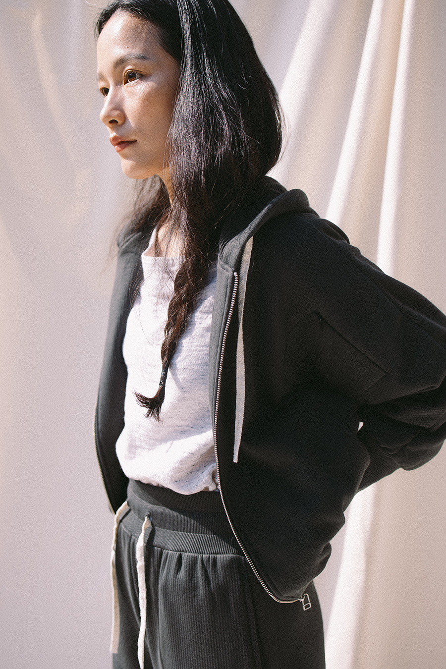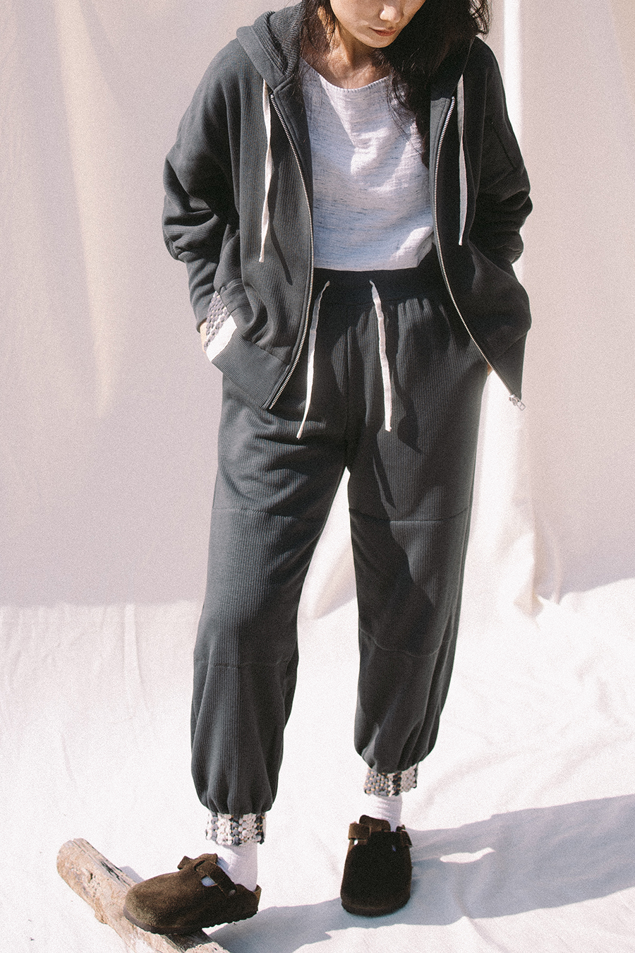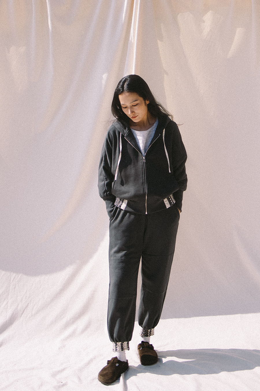 사진의 제품 컬러들마다 위빙 밴드의 높이가 조금씩 차이가 있는데, 최종 본품의 위빙 밴드 높이는 팬츠 5.5cm 후디 6cm 입니다. 기능적으로도 미적으로도 가장 안정적인 높이와 폭으로 작업하였습니다.