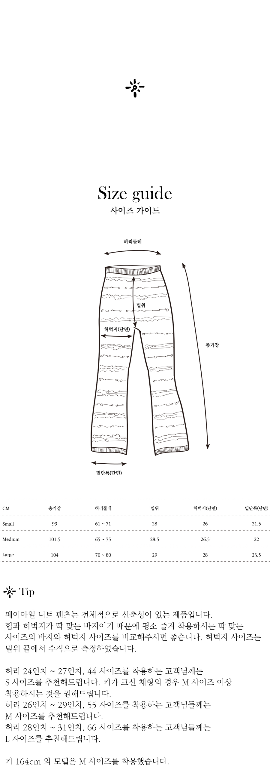 페어아일 니트 팬츠는 전체적으로 신축성이 있는 제품입니다. 기장 수선이 쉽지 않은 제품이라 길이에 대한 고려가 가장 많으실텐데, 저희의 착용 경험에 의하면 키 168cm 정도의 키까지는 M 사이즈를 착용하는 것이 좋았습니다. 바지가 신축성이 있고, 딱 맞게 착용하는 것이 예쁜 바지이기 때문에 업사이즈보다는 정사이즈 또는 다운사이즈가 적절한 사이즈 선택이 되실 것 같습니다. 키 162 ~ 164cm 정도의 평균 체형에게 M 사이즈가 가장 잘 맞습니다.