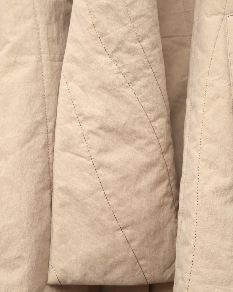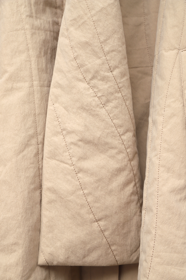 먼저 더 좋은 가격으로 제공해드리지 못하는 점, 송구스럽습니다. 이 코트를 만드는데 가장 어려운 점으로는 역시 불규칙한 곡선 퀼팅 패턴에 있는데, 작업이 어렵고 패턴 도안의 특성상 코트 한 벌을 만드는데 일반적인 퀼팅 소재와 비교하여 원단을 거의 두 배 가까이 사용하게 됩니다.