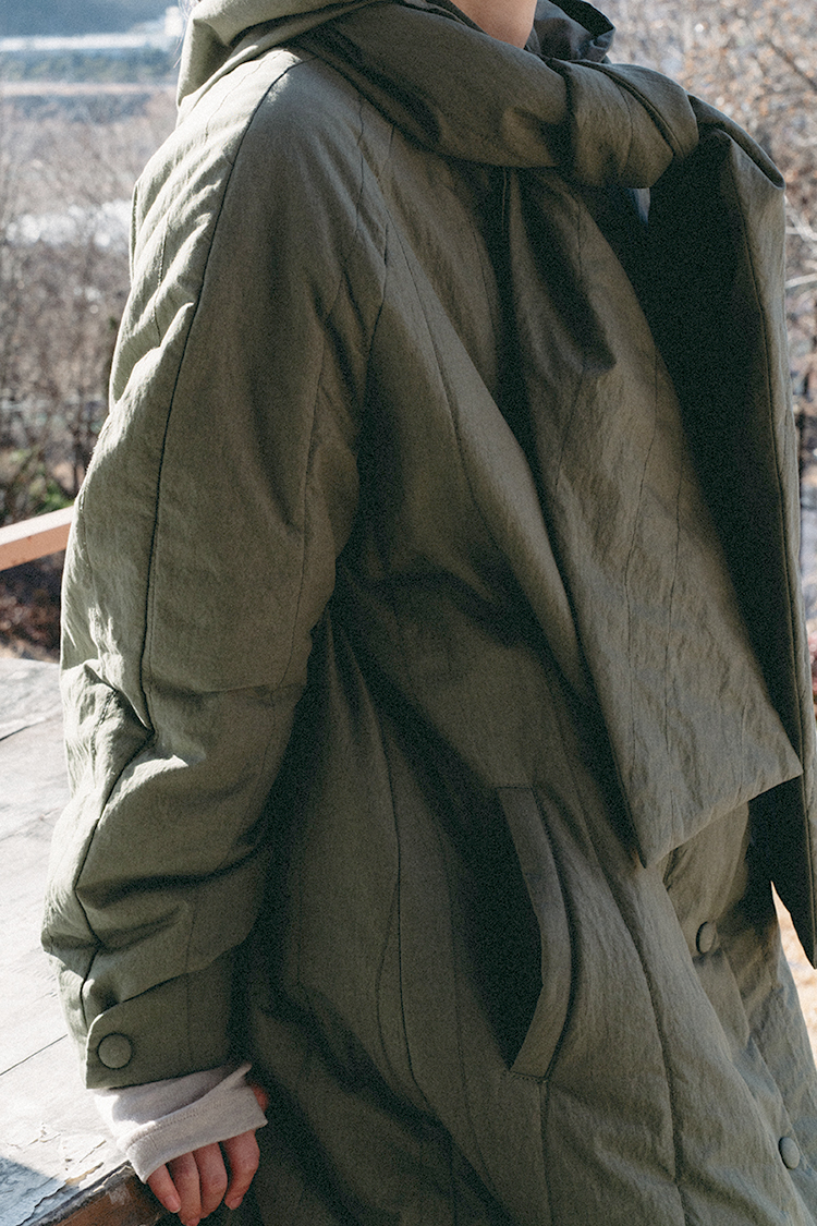 제품을 처음 받아보시면 조금 얇나? 생각하실 수 있는데, 옷을 처음 완성하고 상자에 포장해서 보낸 이후 시간이 지날수록 신슐레이트의 볼륨감이 살아나게 됩니다. 신슐레이트는 너무 많은 중량을 사용하게 되면 옷이 무거워지고, 얇아도 충분히 따뜻하기 때문에 지금같이 추운 날씨에도 한번 야외에서 사용해보시길 바랍니다 :) 핸드 퀼팅 코트는 초봄과 늦가을에도 착용할 수 있도록 제작 의도한 제품입니다.