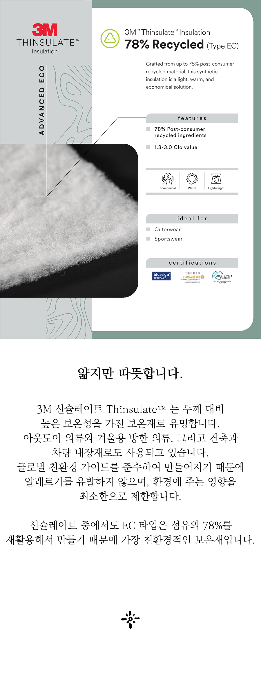 충전재 : 폴리에스터 100%, 섬유의 78% 가 재활용된 3M Thintulate EC-Type 3온스/yd