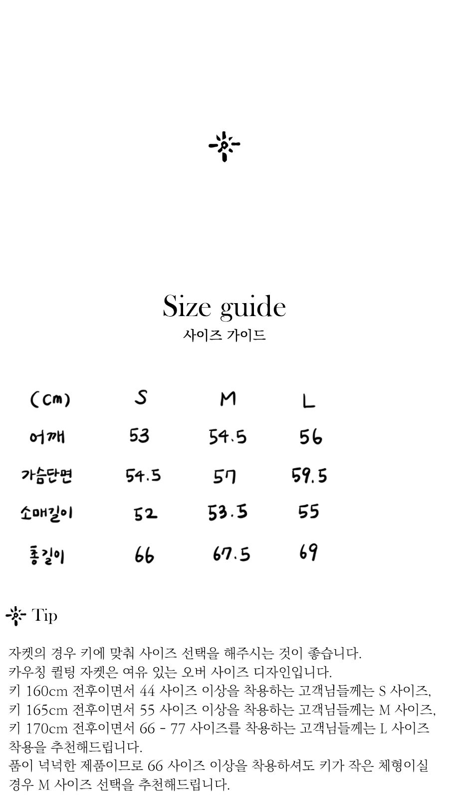 키 160cm 전후이면서 44 사이즈 이상을 착용하는 고객님들께는 S 사이즈, 키 165cm 전후이면서 55 사이즈 이상을 착용하는 고객님들께는 M 사이즈, 키 170cm 전후이면서 66 - 77 사이즈를 착용하는 고객님들께는 L 사이즈 착용을 추천해드립니다. 품이 넉넉한 제품이므로 66 사이즈 이상을 착용하셔도 키가 작은 체형이실 경우 M 사이즈 선택을 추천해드립니다.