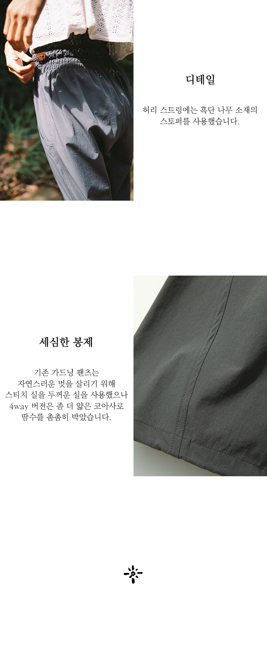 가드닝 팬츠 4way 는 순수하게 수목 고객님들께 영감을 받아 만든 제품으로, 요가나 발레 등 좀 더 활동적인 라이프 스타일을 즐기시는 고객님들을 위해 만들었습니다.