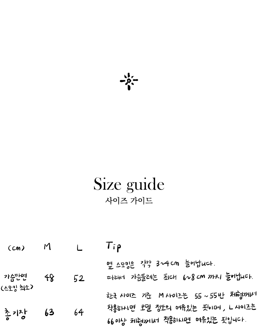 실측 사이즈(cm)는 M: 가슴단면(스모킹 최소) 48 총기장 63 / L: 가슴단면(스모킹 최소) 52 총기장 64 입니다.
