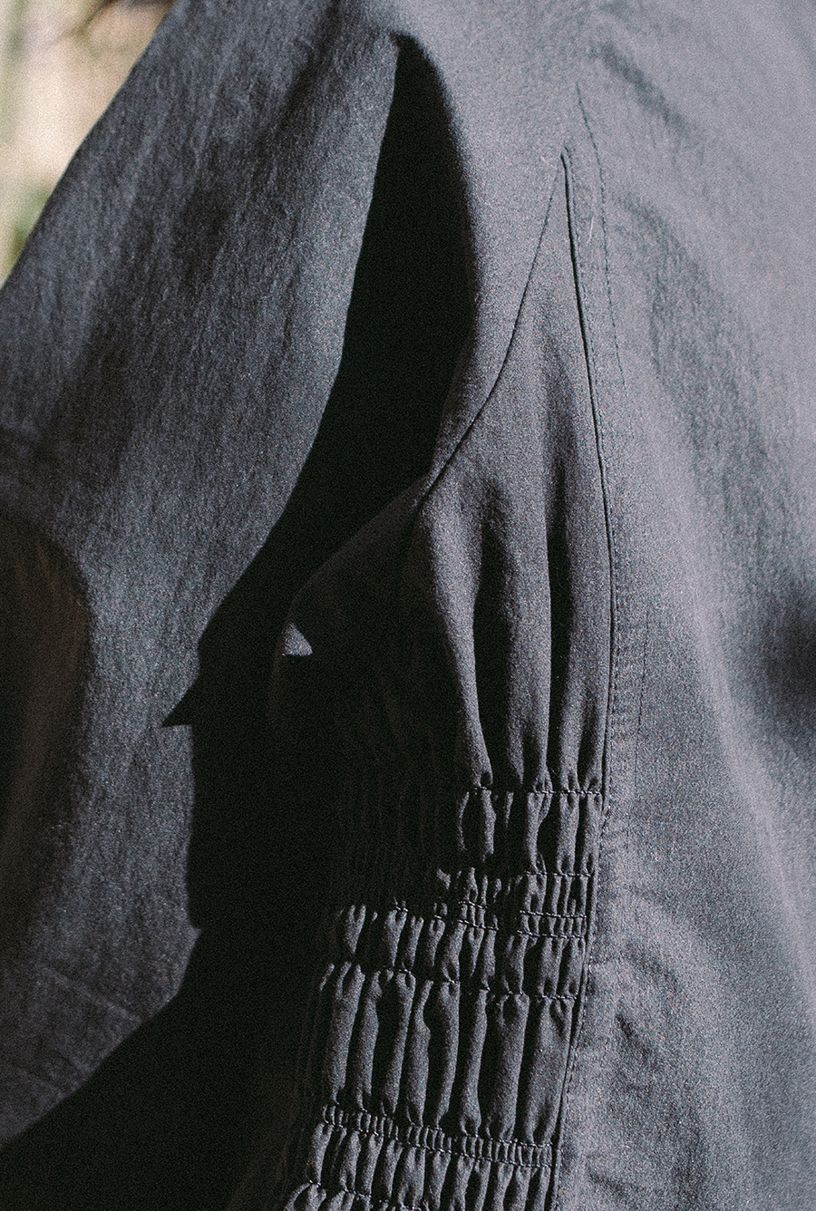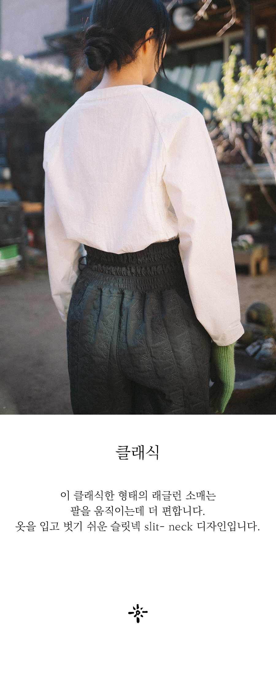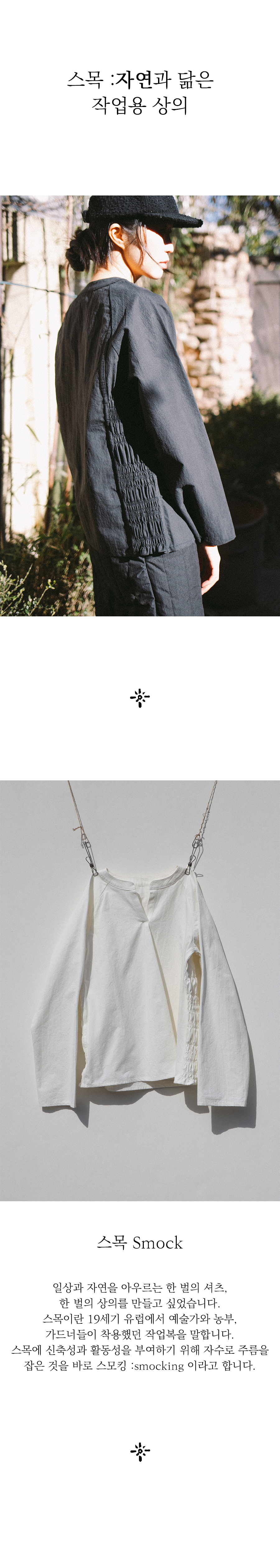 스목은 두 가지 버전의 원단으로 출시되었습니다! 화이트 컬러는 현재 전 세계에서 한 군데서만 가능한 잿물 표백을 한 유기농 면/실크 원단이며, 블랙 컬러는 좀 더 가볍고, 속건성이 있는 기능성 면/나일론 원단입니다.