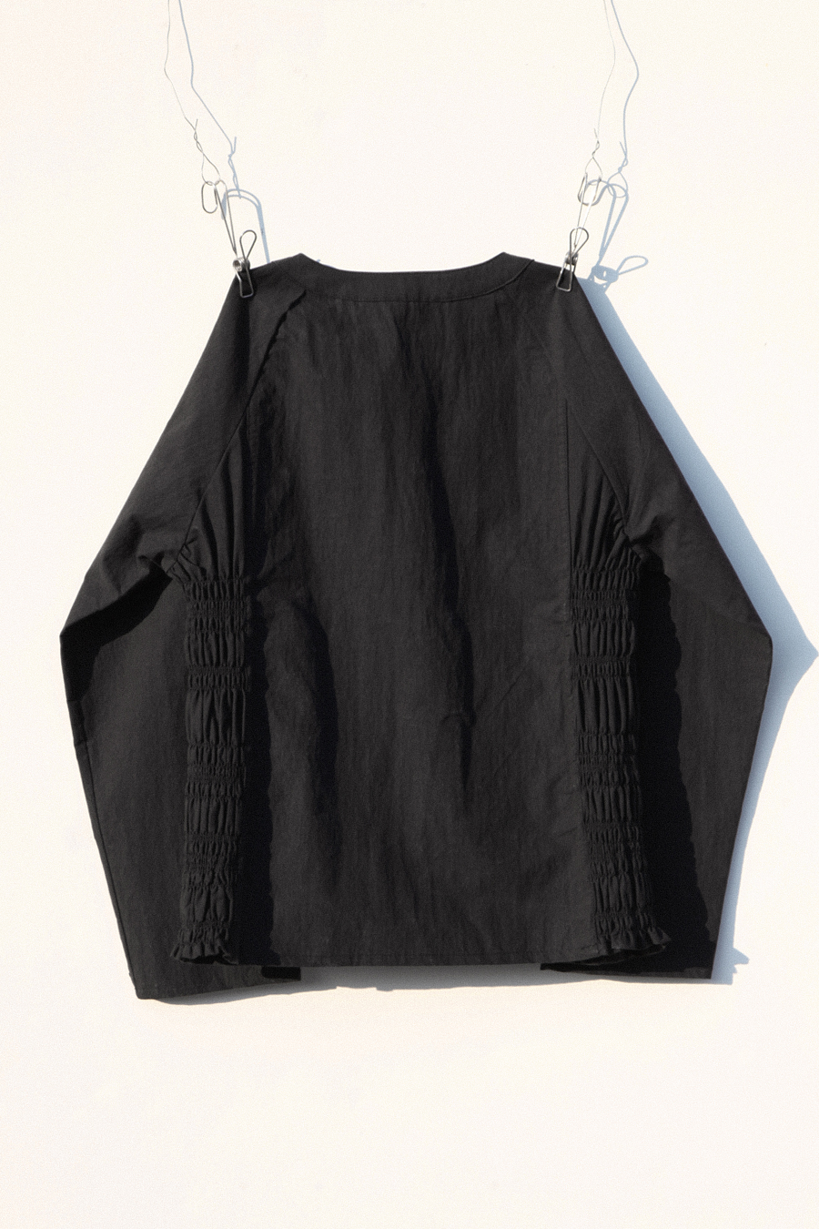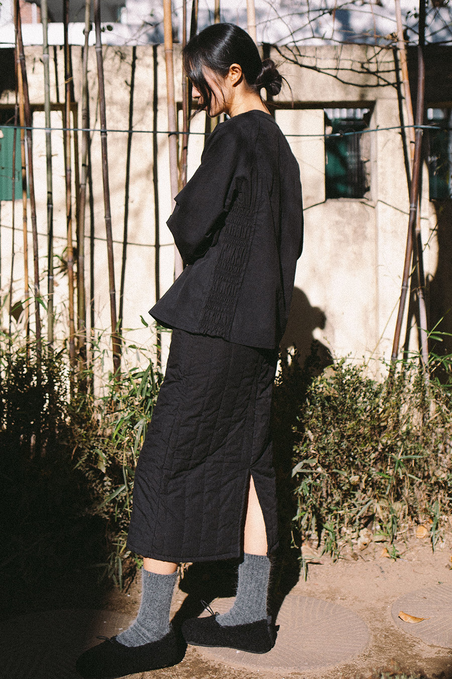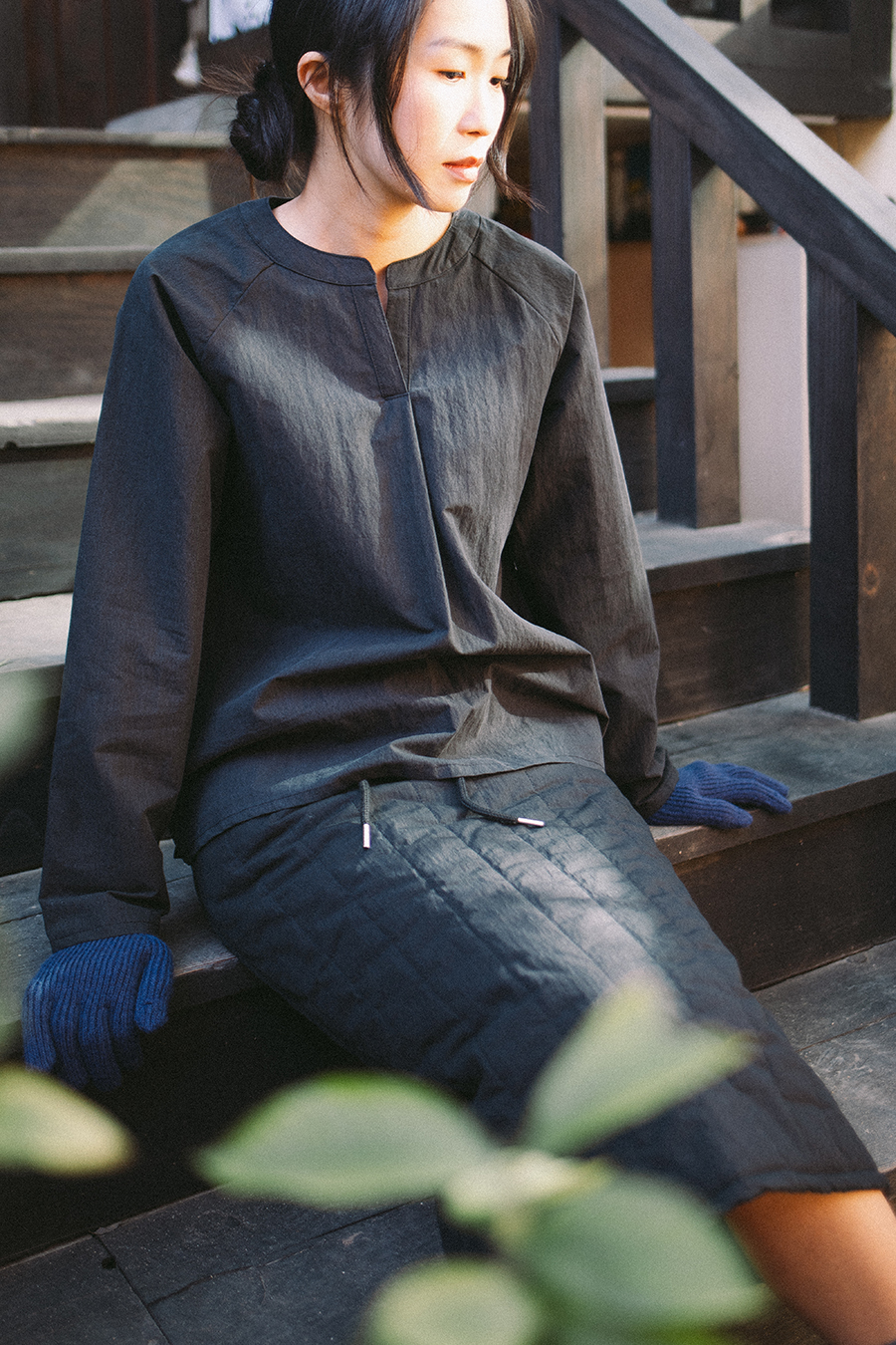스목은 두 가지 버전의 원단으로 출시되었습니다! 화이트 컬러는 현재 전 세계에서 한 군데서만 가능한 잿물 표백을 한 유기농 면/실크 원단이며, 블랙 컬러는 좀 더 가볍고, 속건성이 있는 기능성 면/나일론 원단입니다.